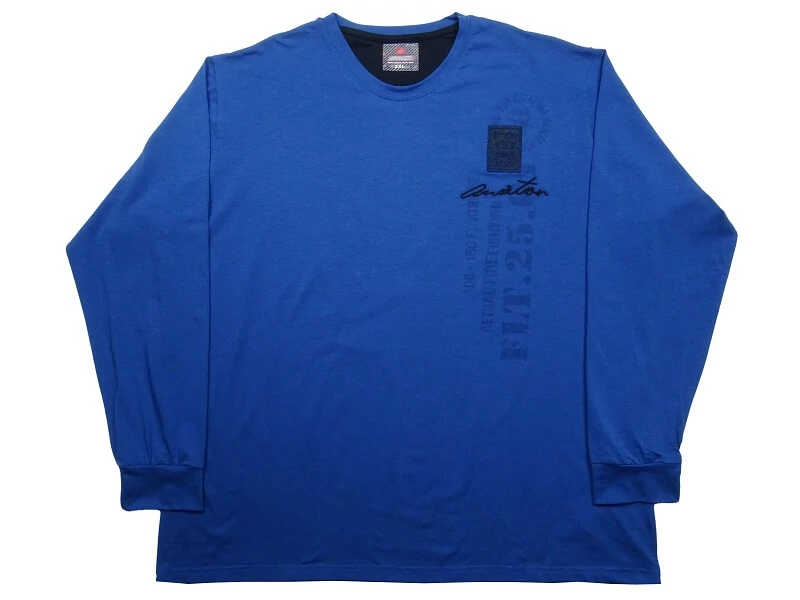 A hosszú ujjú pólók a hideg napok jolly joker ruhadarabja: melegebb, mint egy hagyományos póló, miközben kellően vékony ahhoz, hogy egy pulóvert még rávehessen. Ez az élénk kék színű nagyméretű hosszú ujjú, kerek nyakú póló nem csak megvédi a hidegtől, de stílusos megjelenést is kölcsönöz. A póló elejét hímzett és nyomott felirat díszíti, az ujja passzés, az alja egyenes szabású. Viselje a hétköznapokon egy stílusos farmerral. Egy mellénnyel vagy dzsekivel igazi ütős páros a hűvösebb őszi reggeleken. Rugalmas pamut anyagának köszönhetően akár a nagyobb pocakkal rendelkező férfiaknak is kényelmes viseletet biztosít a hűvös napokon. Nagy 2XL, 3XL, 4XL, 5XL, 6XL méretekben rendelhető.