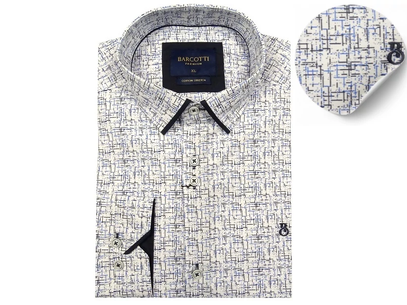 Stílusos és elegáns megjelenés a mindennapokra: fehér alapszínű, dupla galléros és dupla gombos nagyméretű férfi hosszú ujjú ing, mely tökéletesen alkalmas irodai munkához, megbeszélésekre, tárgyalásokra, de akár a hétköznapokra is egy farmerral vagy sportos zakóval kiegészítve. Esküvőre egy minta nélküli, sima öltöny pazar kiegészítője lehet! Az ing különlegessége a részletekben rejlik. A gallér és a mandzsetta sötétkék szegélye, a csíkos gombok valamint a mellkason lévő apró hímzés különös eleganciát sugall. A fehér alapot sötét- és világoskék vonalak, pontok töltik ki labirintus szerűen. Öltözzön a legújabb trend szerint és zsebelje be az elismerő pillantásokat! Klasszikus, egyenes fazon, nagy XL-5XL méretekben rendelhető.