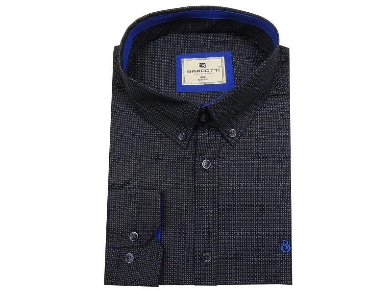 Sportosan elegáns megjelenés a mindennapokra: sötétkék alapszínű, apró mintás, nagyméretű férfi hosszú ujjú ing legombolható gallérral, mely tökéletesen alkalmas irodai munkához, megbeszélésekre vagy akár hétköznapokra is egy farmerral vagy sportos zakóval kiegészítve. Az ing anyagában apró mintás, mellkasát hímzett logó teszi különlegessé. A sötétkék alapot apró királykék minta teszi egyedivé. A színátmenetes gombok remekül passzolnak az ing mintájához és színéhez. A nyak és a mandzsetta belseje királykék színű akárcsak a minta. Öltözzön a legújabb trend szerint és zsebelje be az elismerő pillantásokat! Klasszikus, egyenes fazon, extra nagy 6XL-9XL méretekben kapható.