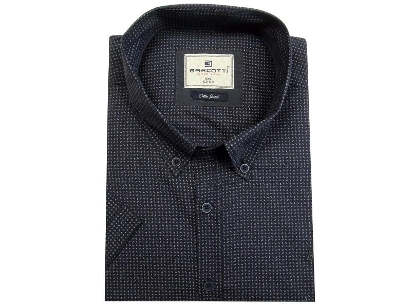 Tökéletes elegancia hétköznapokra és különleges alkalmakra: sötétkék alapszínű, szürke apró mintás nagyméretű férfi rövid ujjú ing, mely ideális választás irodai munkához, megbeszélésekre, tárgyalásokra, esküvőre de akár a hétköznapokra is egy farmerral vagy sportos zakóval kiegészítve. Anyagában apró szürke mintás, mellyel összhangban vannak a csíkos gombok. Klasszikus, egyenes fazon kifejezetten testes, pocakos férfiak igényeinek megfelelő szabással. Közkedvelt darab a testes férfiak körében. Extra nagy 6XL, 7XL, 8XL, 9XL méretekben rendelhető.