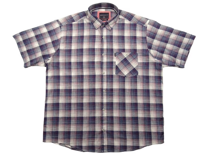 B.Sötétkék bordó kockás, zsebes nagyméretű férfi rövid ujjú lenvászon ing bemutatása: