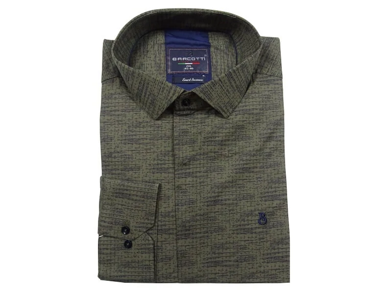 Elegáns megjelenés a mindennapokra: keki színű, sötét mintázattal nagyméretű férfi hosszú ujjú ing rejtett gombolással, mely tökéletesen alkalmas irodai munkához, megbeszélésekre, tárgyalásokra, de akár a hétköznapokra is egy farmerral vagy sportos zakóval kiegészítve. Az ing mintázata különleges, vonalakkal teli. Mellkasán apró hímzés található. A sötétkék gombok összhangban vannak az ing küllemével. Öltözzön a legújabb trend szerint és zsebelje be az elismerő pillantásokat! Klasszikus, egyenes fazon, nagy 2XL-6XL méretekben rendelhető.