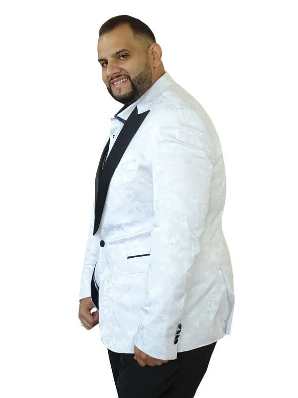 Nagyméretű rendkívül elegáns ceremónia öltöny. Ez a ceremónia öltöny kifejezetten testes, pocakos, mackós testalkatú férfiak igényeire lett szabva. A zakó fényes, anyagában mintás, nyitott hajtókás fekete színű gallérral, mellzsebbel, egy gombos záródással, zsebfedős oldalzsebekkel valamint belső zsebekkel rendelkezik. Mandzsettája elegáns négy gombos. Hátul két sliccel rendelkezik, ami igazán praktikus megoldást jelent a pocakkal rendelkező férfiak részére. A nadrág fekete színű, mely tökéletes kombinációja a hófehér zakónak. Ebben a három részes ceremónia öltönyben a vőlegény biztosan elkápráztatja menyasszonyát és a násznépet is! Jöjjön el üzletünkben, ahol nem csak segítünk kiválasztani a megfelelő fazont és méretet, hanem amennyiben szükséges helyben Önre igazítjuk a kiszemelt öltönyt.