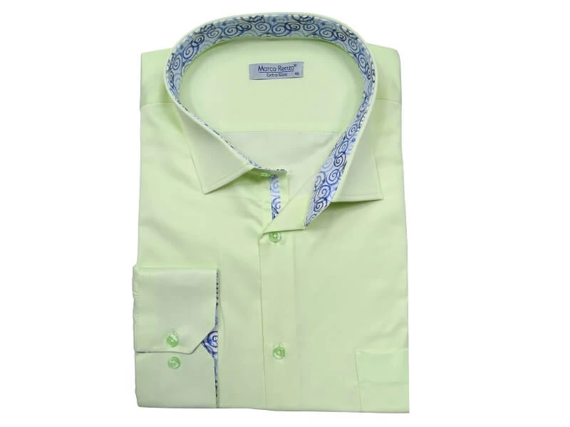Tökéletes elegancia hétköznapokra és különleges alkalmakra: sima almazöld színű, minta nélküli nagyméretű férfi hosszú ujjú ing, mely ideális választás irodai munkához, megbeszélésekre, tárgyalásokra, de akár a hétköznapokra is egy farmerral vagy sportos zakóval kiegészítve. Az inget külleme letisztult, gombjai zöld színűek, mellkasán egy zseb található, amibe kisebb értékeit is elrakhatja. A gallér és a mandzsetta belseje mintás, egyedi. Klasszikus, egyenes fazon kifejezetten testes, pocakos férfiak igényeinek megfelelő szabással. Akár extra nagy 6XL, 7XL, 8XL, 9XL, 10 XL méretekben is rendelhető.
