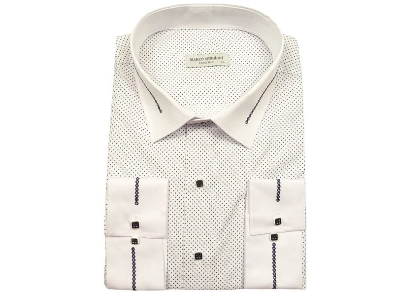 Tökéletes elegancia hétköznapokra és különleges alkalmakra: fehér alapon sötétkék pöttyös extra nagyméretű férfi hosszú ujjú ing, mely ideális választás irodai munkához, esküvőre, színházi látogatásokra de akár a hétköznapokra is egy farmerral vagy sportos zakóval kiegészítve. Különlegessége a kontrasztos fehér színű gallér és a mandzsetta, melyet egyedi varrott minta díszít. A szögletes, felemás színű gombok játékosságot visznek az ing küllemében. Klasszikus, egyenes fazon kifejezetten testes, pocakos férfiak igényeinek megfelelő szabással. Extra nagy 4XL-11XL méretekben kapható.