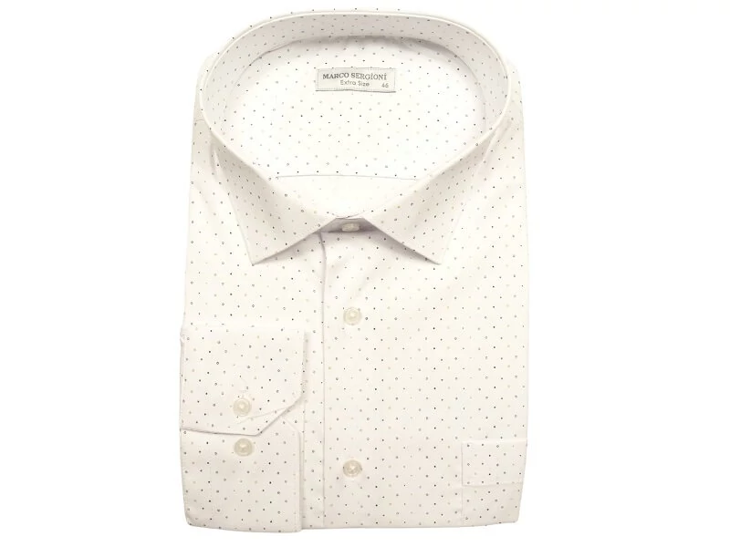 Tökéletes elegancia hétköznapokra és különleges alkalmakra: fehér alapon barna pöttyös extra nagyméretű férfi hosszú ujjú ing, mely ideális választás irodai munkához, megbeszélésekre, tárgyalásokra, de akár a hétköznapokra is egy farmerral vagy sportos zakóval kiegészítve. Az ing mellkasán egy zseb található, amibe kisebb értékeit is elrakhatja. A gallér és a mandzsetta belseje is pöttyös, egyedi. Klasszikus, egyenes fazon kifejezetten testes, pocakos férfiak igényeinek megfelelő szabással. Extra nagy 4XL, 5XL, 6XL, 7XL, 8XL, 9XL, 10XL, 11XL méretekben rendelhető.