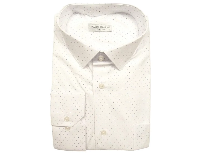 Tökéletes elegancia hétköznapokra és különleges alkalmakra: fehér alapon kék pöttyös extra nagyméretű férfi hosszú ujjú ing, mely ideális választás irodai munkához, megbeszélésekre, tárgyalásokra, de akár a hétköznapokra is egy farmerral vagy sportos zakóval kiegészítve. Az ing mellkasán egy zseb található, amibe kisebb értékeit is elrakhatja. A gallér és a mandzsetta belseje is pöttyös, egyedi. Klasszikus, egyenes fazon kifejezetten testes, pocakos férfiak igényeinek megfelelő szabással. Extra nagy 4XL, 5XL, 6XL, 7XL, 8XL, 9XL, 10XL, 11XL méretekben rendelhető.