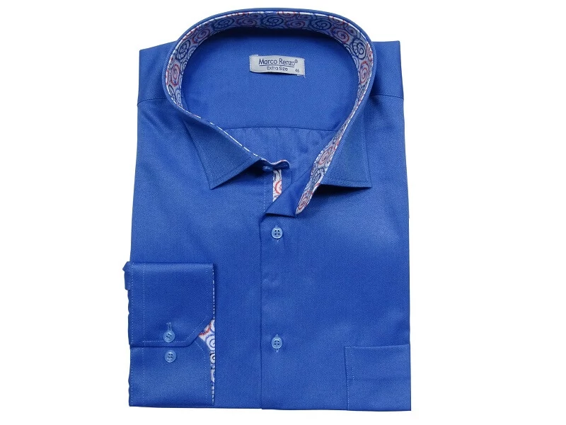 Tökéletes elegancia hétköznapokra és különleges alkalmakra: sima királykék színű, anyagában vékony halszálka mintás nagyméretű férfi hosszú ujjú ing, mely ideális választás irodai munkához, megbeszélésekre, tárgyalásokra, de akár a hétköznapokra is egy farmerral vagy sportos zakóval kiegészítve. Az inget külleme letisztult, gombjai kék színűek, mellkasán egy zseb található, amibe kisebb értékeit is elrakhatja. A gallér és a mandzsetta belseje mintás, egyedi. Klasszikus, egyenes fazon kifejezetten testes, pocakos férfiak igényeinek megfelelő szabással. Akár extra nagy 6XL, 7XL, 8XL, 9XL, 10 XL méretekben is rendelhető.