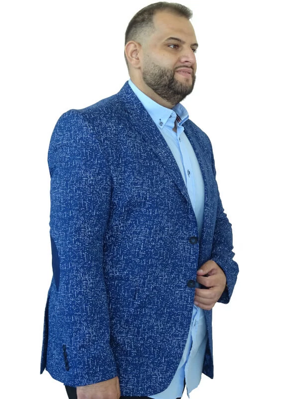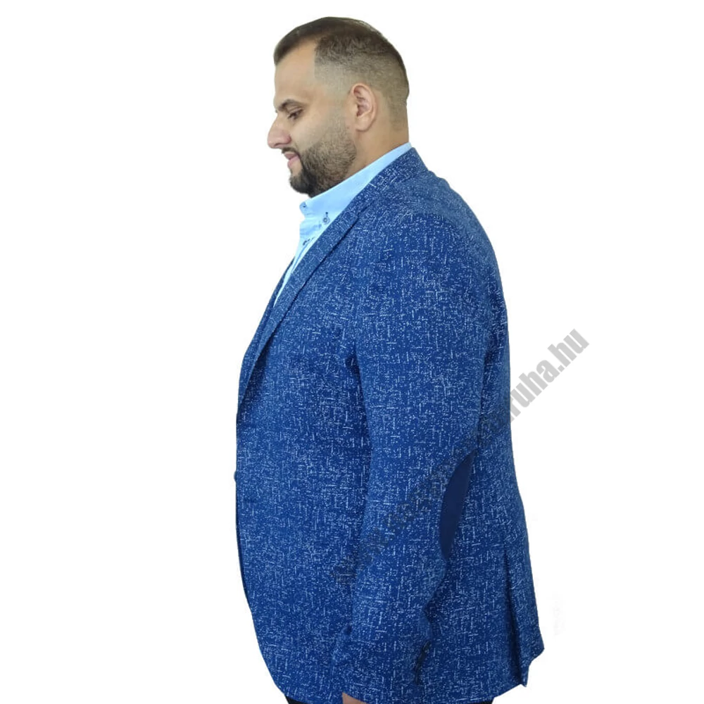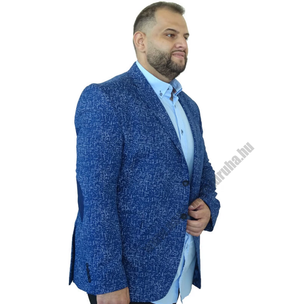 Nyári vidám nagyméretű sötétkék, világoskék mintás zakó a tökéletes eleganciához, mely egyedi megjelenést kölcsönöz. Metszett hajtókás, mellzsebbel, elöl két gombbal, zsebfedős előzsebekkel, dekoratív gombos kézelővel, könyökfoltokkal, hátul hasítékkal, Belül bélelt és zsebbel rendelkezik. Sötétkék színe egyedi és divatos. Ebben a nagyméretű zakóban biztosan elegánsan fog festeni akár üzleti megbeszélésre, akár különleges alkalomra készül. Ez a zakó kifejezetten nagyméretű férfiak igényeire lett szabva. Próbálja ki Ön is milyen a Mr.BB Big Size egyedi, minőségi zakója. Legyen elegáns, tökéletes a legkülönlegesebb alkalmakkor is!