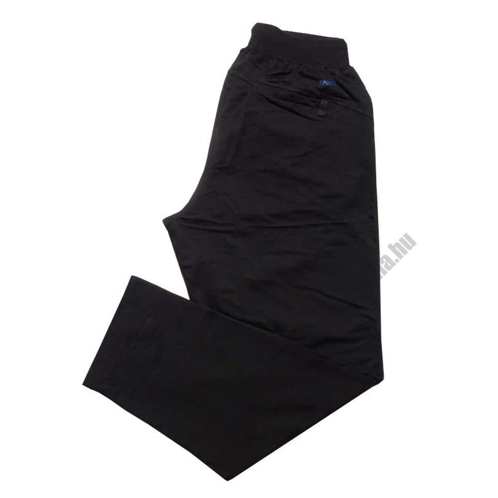 Nagyméretű sötétkék színű, melegítő nadrág, díszítő csíkkal ellátott cipzáras zsebekkel. Kényelmes viselet akár szabadidős tevékenységhez akár a rohanós hétköznapokon. Vékonyabb rugalmas anyagból készült, sportoláshoz, otthoni tevékenységhez vagy akár bevásárláshoz is ideális. A melegítő nadrág egyenes szárvéggel és húzózsinóros gumis derékkal rendelkezik, mely tökéletesen illeszkedik alakjához, nagyobb pocakon is kényelemes viselhető. Extra nagy méretben is rendelhető, 2XL-10XL ig.