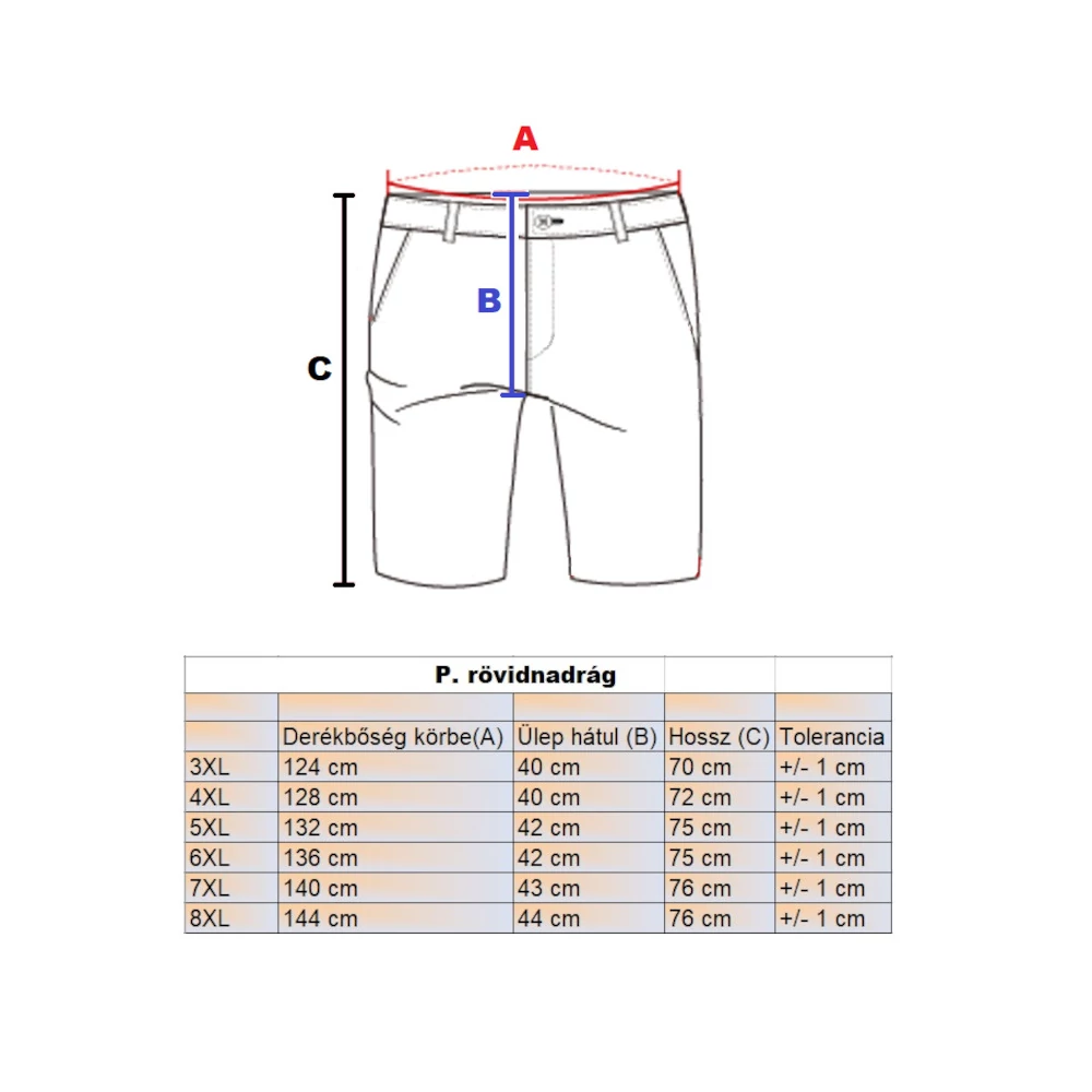 Mérettáblázat a P.Zöld terepmintás oldalzsebes nagyméretű férfi pamut rövidnadrághoz: