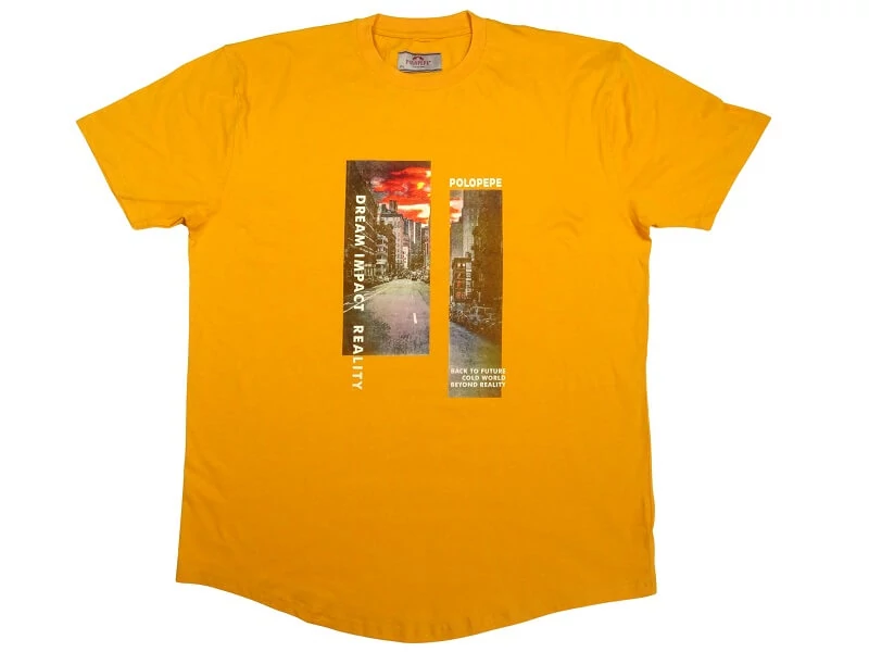 Divatos, nyomott mintás rövid ujjú póló a hétköznapokra: nyáron önmagában, télen akár aláöltözetnek is kiváló. Ez az arzénsárga színű, kerek nyakú nagyméretű férfi póló a legnagyobb hőségben is kellemes viseletet biztosít. Hétköznapokra, munkába járáshoz, szabadidős tevékenységekhez vagy akár sportoláshoz is megfelelő viselet. Egy farmerral vagy rövidnadrággal kiegészítve stílusos megjelenést kölcsönöz. Elejét divatos utca kép és feliratok teszik különlegessé valamint a lekerekített alja. Hűvösebb időben kardigánnal vagy pulóverrel is remekül mutat. Nagy 3XL, 4XL, 5XL, 6XL méretekben kapható. Kényelmes viselet egész napra.