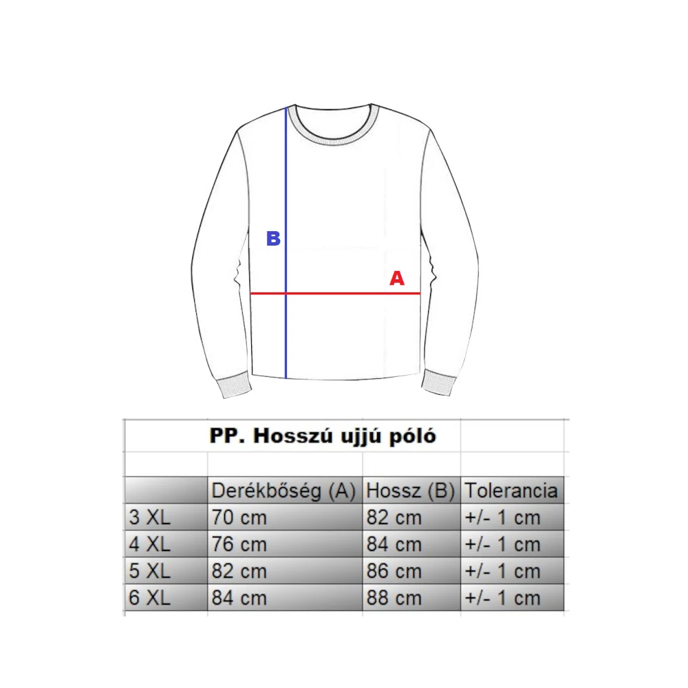Mérettáblázat a PP.Sötétkék Brooklyn férfi nagyméretű hosszú ujjú pólóhoz: