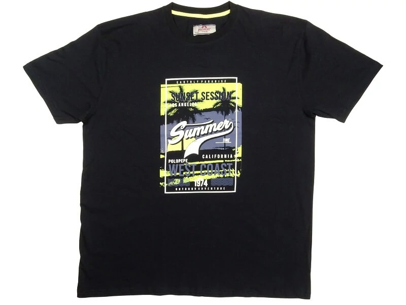 Divatos, nyomott mintás rövid ujjú póló a hétköznapokra: nyáron önmagában, télen akár aláöltözetnek is kiváló. Ez a sötétkék színű, kerek nyakú nagyméretű férfi póló a legnagyobb hőségben is kellemes viseletet biztosít. Hétköznapokra, munkába járáshoz, szabadidős tevékenységekhez vagy akár sportoláshoz is megfelelő viselet. Egy farmerral vagy rövidnadrággal kiegészítve stílusos megjelenést kölcsönöz. Elejét színes nyomott tengerparti minta és felirat díszíti. Hűvösebb időben kardigánnal vagy pulóverrel is remekül mutat. Nagy 3XL, 4XL, 5XL, 6XL méretekben kapható. Kényelmes viselet egész napra.
