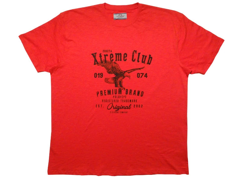 Férfi nagyméretű, kerek nyakú, élénk piros színű, rövid ujjú póló. Nyomott feliratos és sas mintás. Vékony 100% pamut, jó nedvszívó és légáteresztő anyaga a legnagyobb hőségben kellemes viseletet biztosít. Sportos megjelenéshez nem hiányozhat egy kényelmes rövid ujjú póló. Ha szeretne egy különleges,élénk színű pólót, válassza ezt a nagyméretű PP. X, Piros rövid ujjú pólót. Az alap cirmos korall színen kitűnik a fekete színű sas. Sportoláshoz, kiránduláshoz, hétköznapokra vagy nyaraláskor remek választás! 3XL, 4XL, 5XL, 6XL méretekben rendelhető.