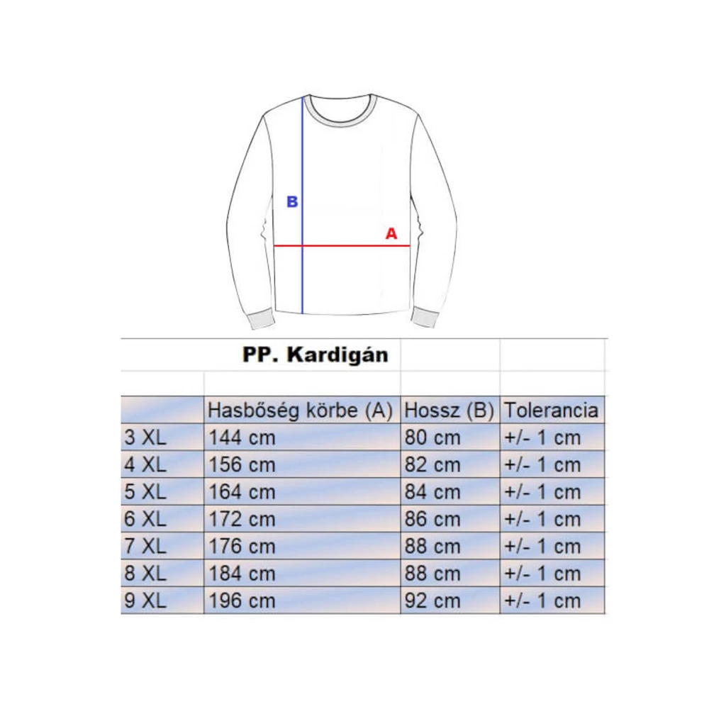 Mérettáblázat a PP.Fekete-szürke férfi nagyméretű steppelt cipzáras pulóverhez:
