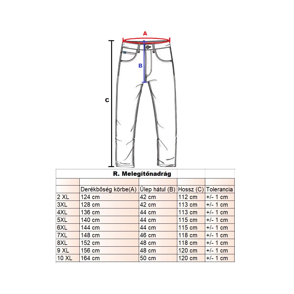 Mérettáblázat a R. Fekete,zöld csíkos vastag férfi extra nagyméretű melegítőnadrághoz: