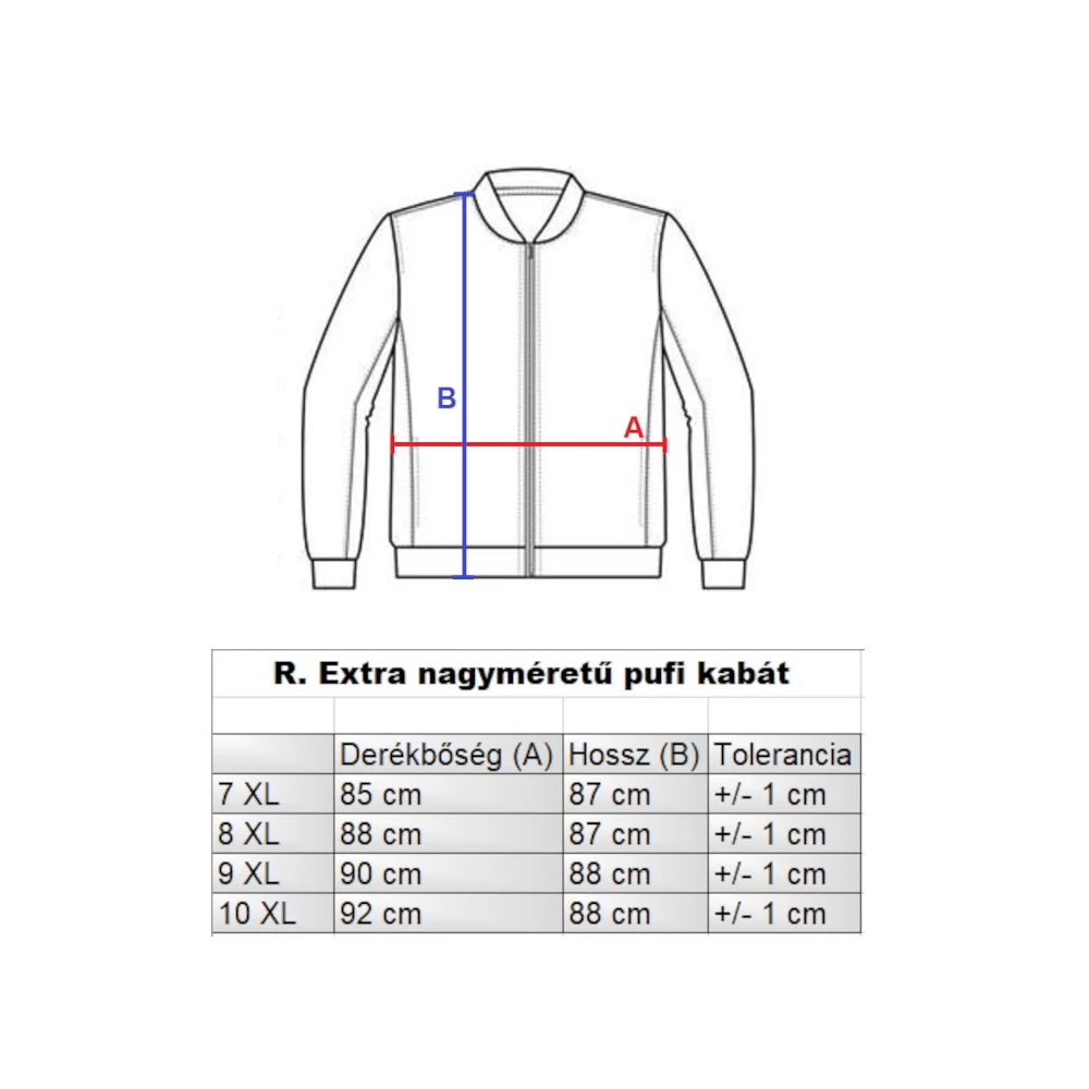 Mérettáblázat az R.Keki cirmos Extra nagyméretű férfi pufi kabáthoz: