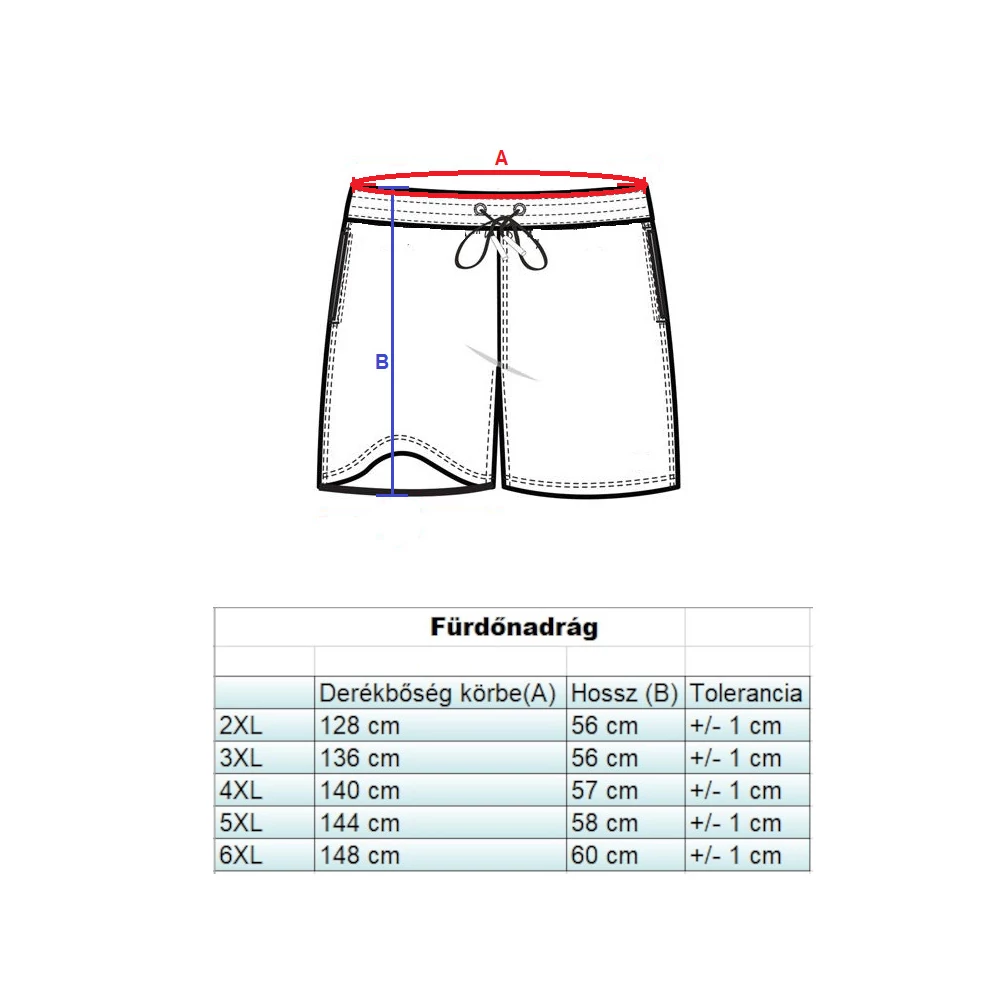 A nyár slágerterméke: nagyméretű férfi fürdőnadrág. Szinte elképzelhetetlen a nyaralás, kiruccanás, wellness vagy csak az otthoni csobbanás egy kényelmes fürdőnadrág nélkül. Ez a fekete színű úszógatya a gumis, húzózsinóros dereka miatt jól illeszkedik minden férfi testalkathoz, még akkor is, ha extra nagy mérettel vagy pocakkal rendelkezik! A fürdőnadrág szárát csíkok és színes hímzett feliratok teszik különlegessé. Elöl kettő, hátul egy biztonságos cipzáras zseb található. Könnyű benne a szabad mozgás, így szabadidős tevékenységekhez is kiváló. Anyaga gyorsan szárad, jól szellőzik. Minden férfinak kötelező alapdarab. 2XL, 3XL, 4XL, 5XL, 6XL extra méretekben kapható.