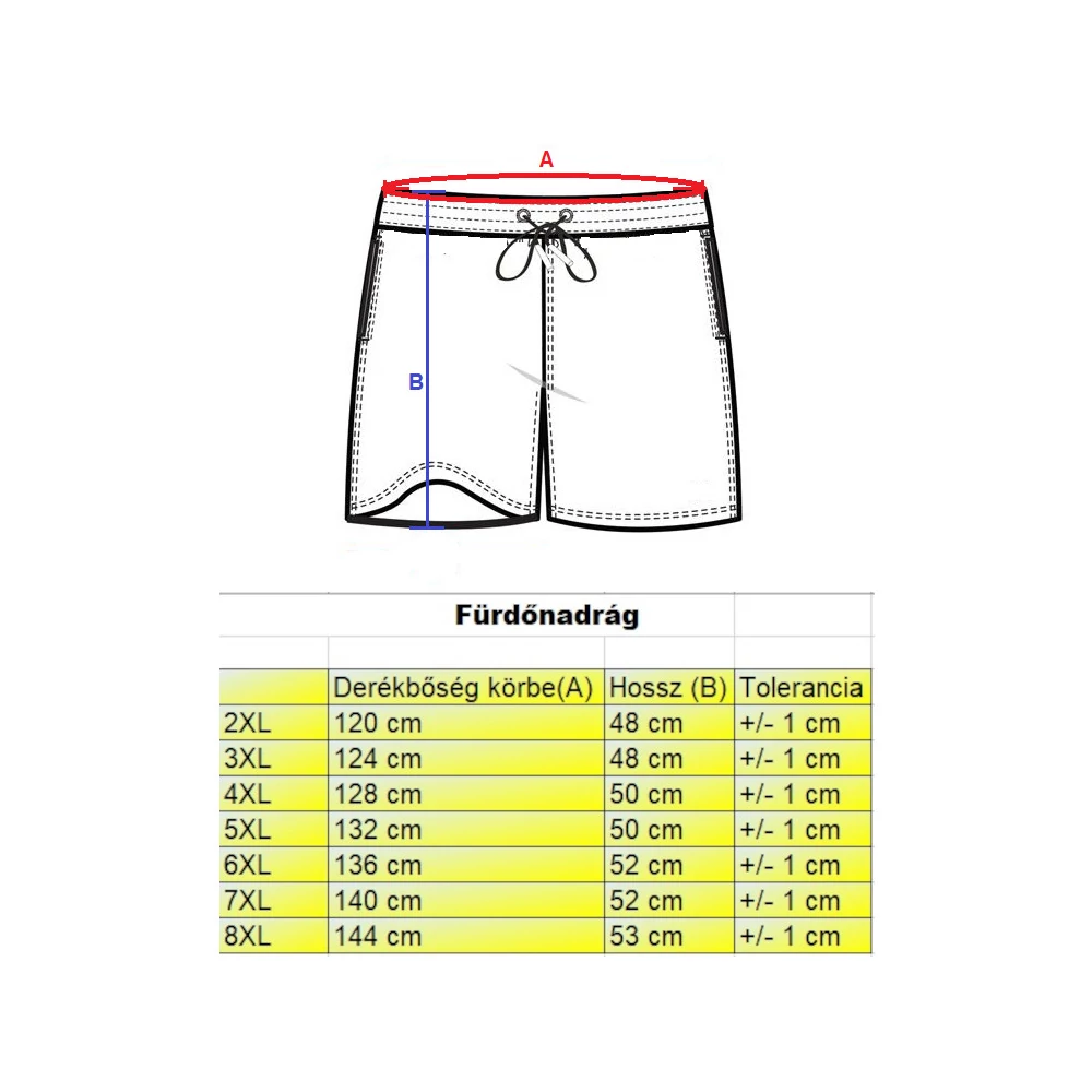 Sötétkék színű, zsebes úszónadrág extra nagy méretekben, mely a nyár nélkülözhetetlen ruhadarabja. A testes férfiak kedvence ez sima egyszínű de nagyon mutatós úszónadrág, melynek szárát csupán egy vékony fehér csík díszíti. Gumis, húzózsinóros dereka jól illeszkedik minden férfi testalkatához. Bő szára kényelemes, szabad mozgást biztosít minden tevékenységhez. Elöl kettő, hátul egy zsebbel, belül necc sorttal rendelkezik. Anyaga gyorsan szárad, ezért praktikus választás a vizes helyeken való viselése. Élvezze a nyarat ezzel a Sötétkék, fehér csíkos úszónadrággal. Extra nagy méretekben, 2XL, 3XL, 4XL, 5XL, 6XL, 7XL, 8XL is rendelhető.