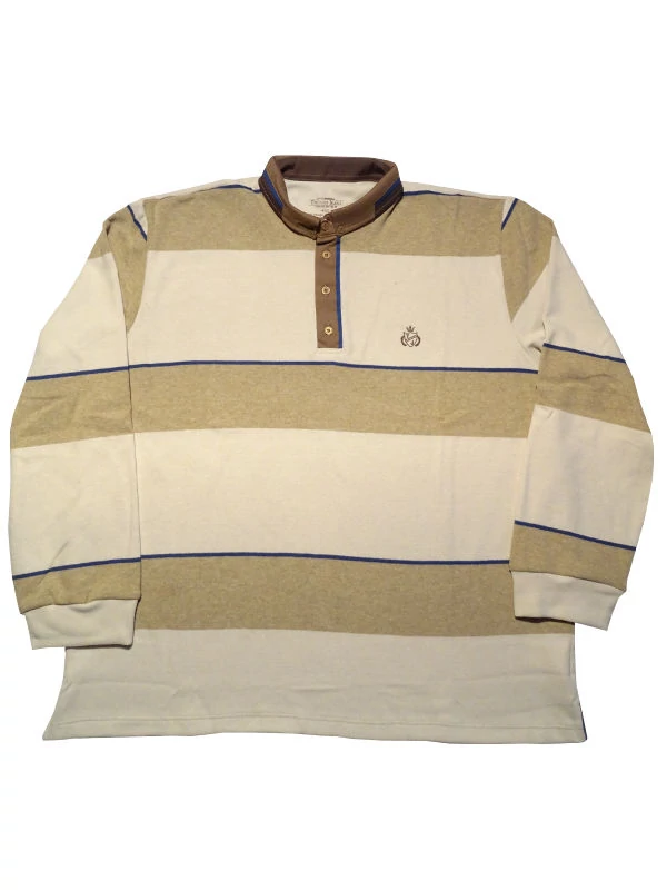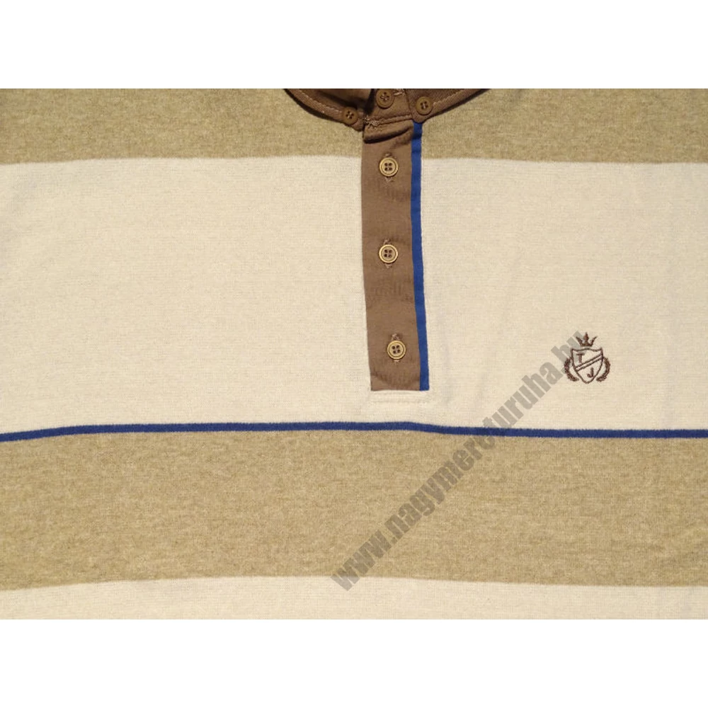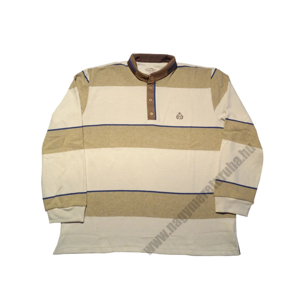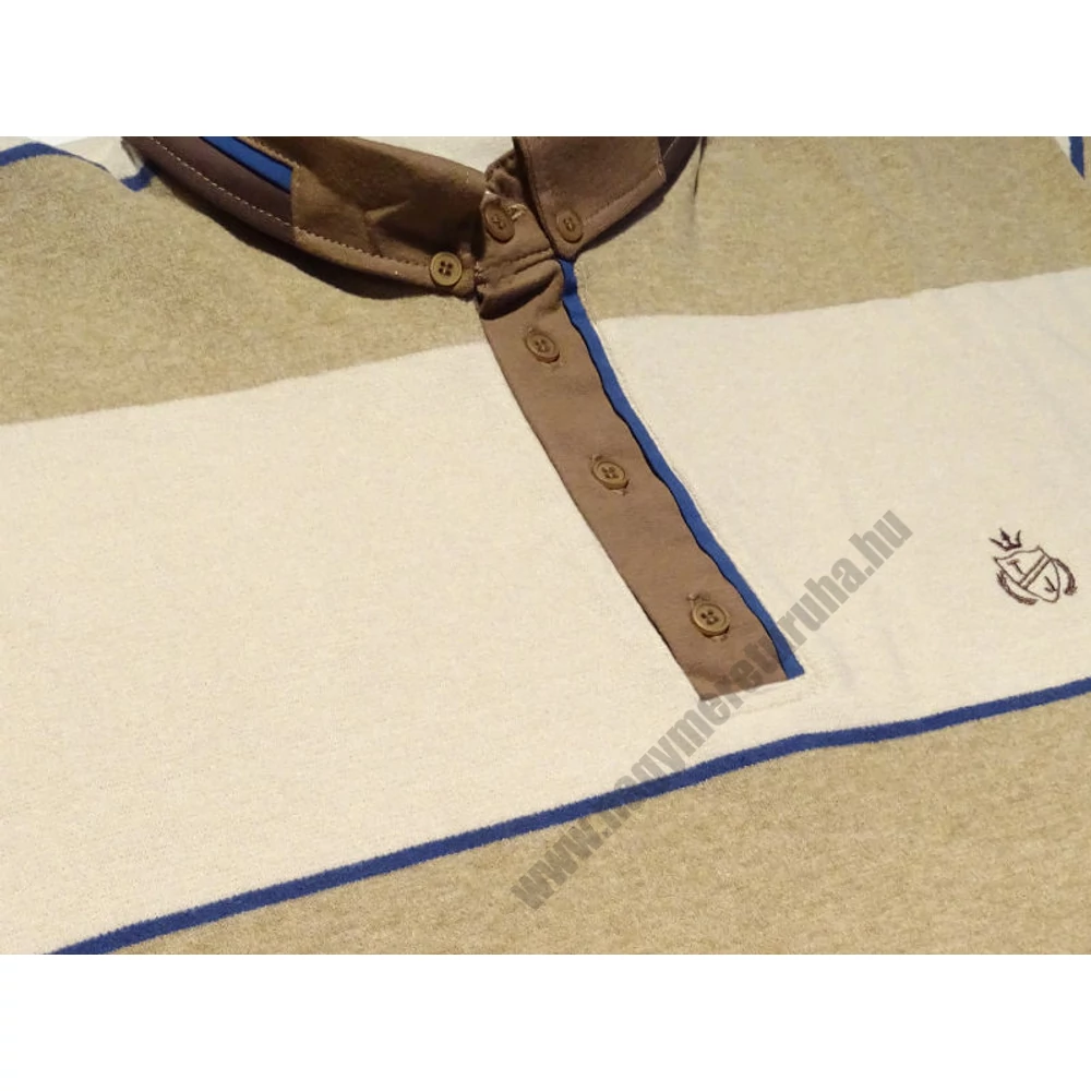 Drapp-barna színű, vastag csíkos, nagyméretű férfi galléros pulóver. Ha szeretne a hétköznapokon is elegánsan mutatkozni, de nem szeretne öltönyt felvenni, jó választás egy sportos-elegáns, galléros pulóver. Ez a T. Barna csíkos, galléros pulóver nagyon puha és könnyű, a mozgásban nem akadályozza. Az alap drapp színhez, barna vastag csíkok társulnak, amit a kék vékony csíkok tesznek teljessé. A gallér barna színe és kék csíkja, extra sármot sugároz. A mellkason lévő apró hímzett logó koronázza meg a pulóver külsejét. Felveti barna, drapp, kék nadrágokhoz. Különböző színű és típusú nadrágokkal, különböző hatást érhet el, elegánsabbat vagy éppen sportosabbat. Nagy méretekben kapható XL-6XL-ig.
