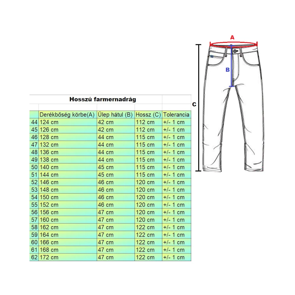 Egyetlen szekrényből sem hiányozhat ez a méltán népszerű fekete színű, klasszikus szabású nagyméretű férfi hosszú farmernadrág. Hétköznapokra kedvelt viselet, hiszen mindenhez jól passzol. Sportos pólóhoz, pulóverhez vagy akár egy jól megválasztott sportos zakóhoz, inghez. A farmer minta nélküli, elöl lekerekített, hátul egyenes zsebekkel rendelkezik. Ha szereti a sportos megjelenést, de fontos a kényelem, válassza ezt a farmert, mely kifejezetten testes, pocakos férfiaknak készült gondos odafigyeléssel.